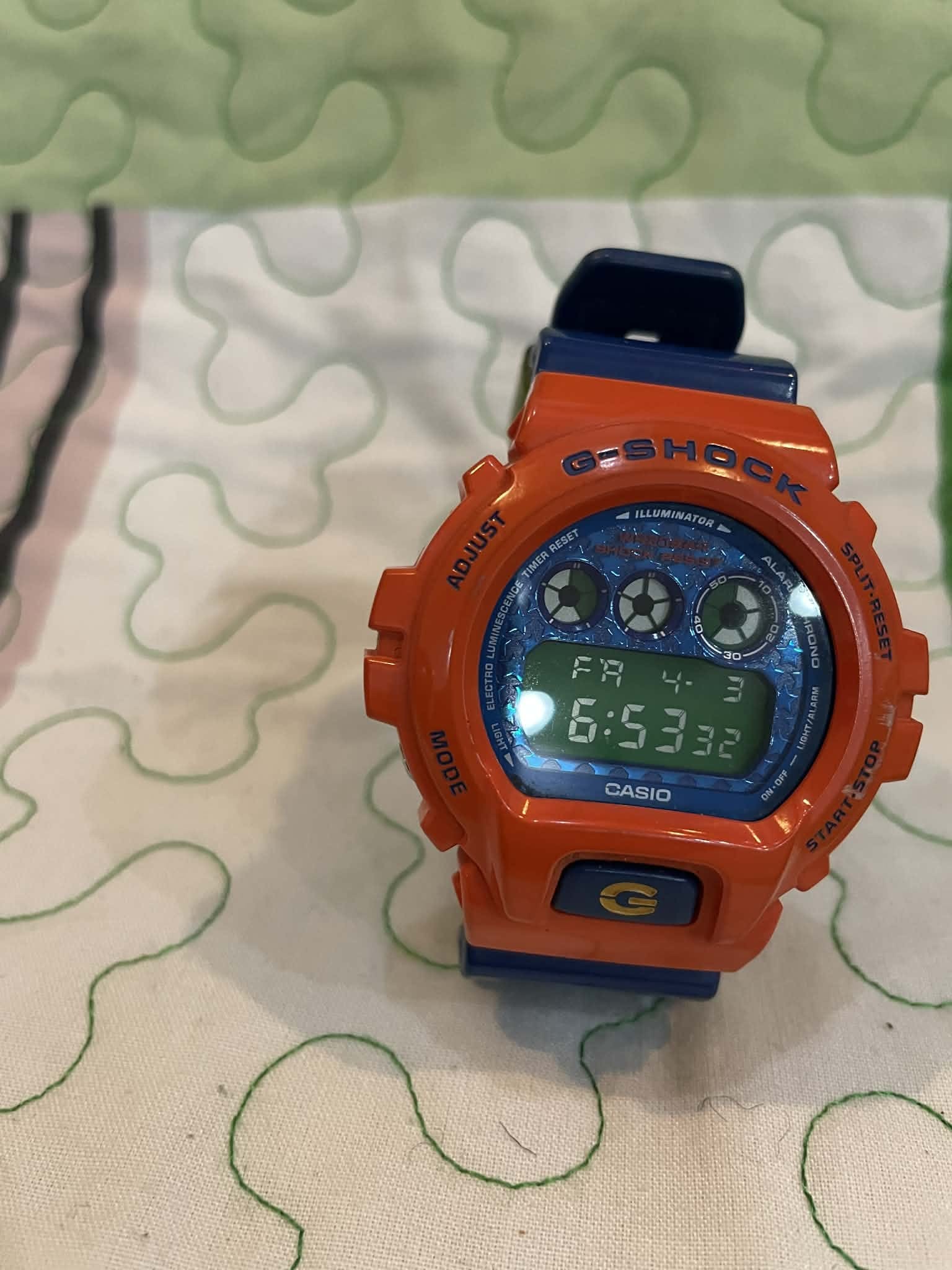 | Description | Vintage G-Shock DW6900 in orange and blue |